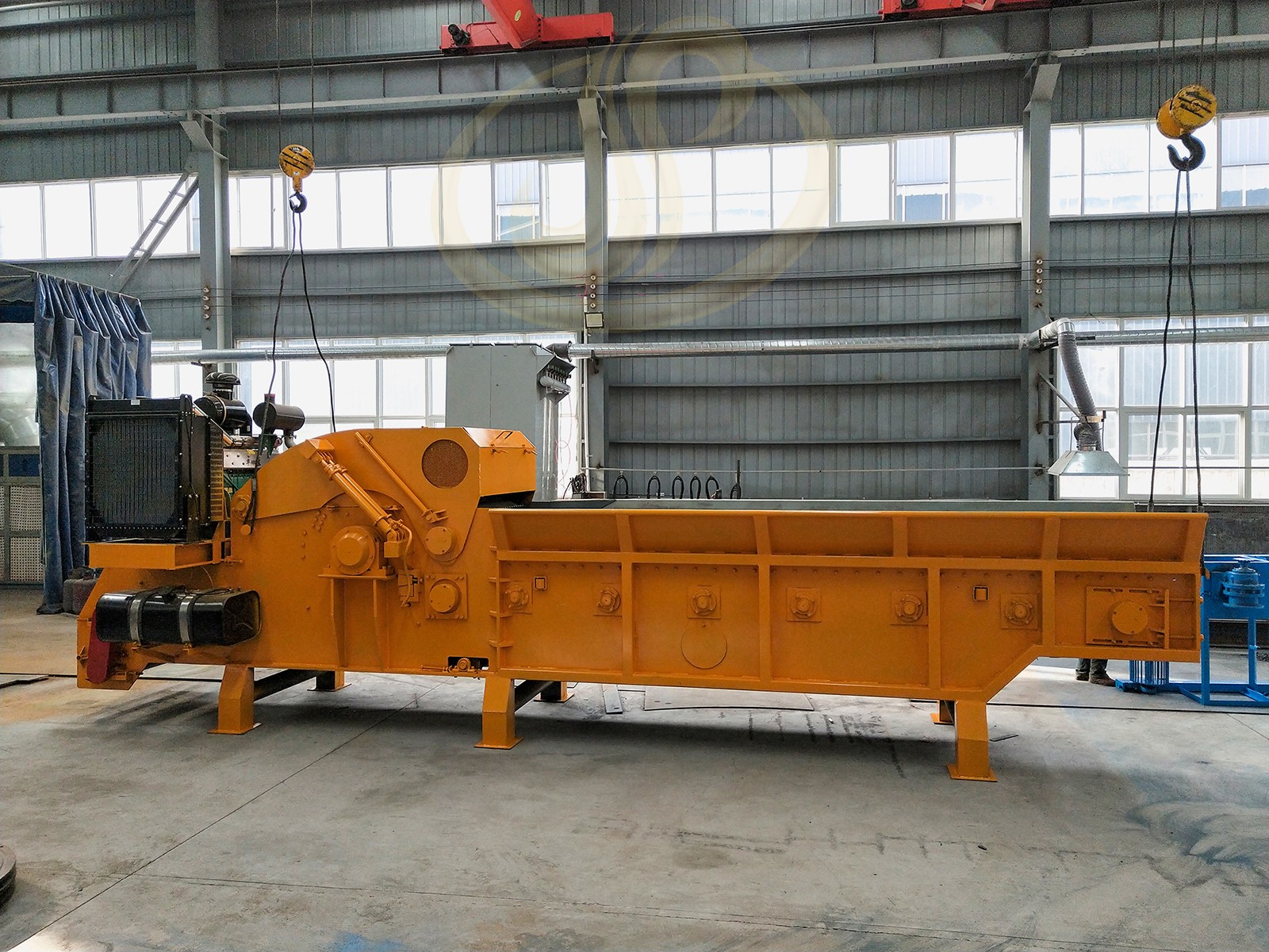 **步是上料。在原料堆场,装载机将成堆的废旧木材铲起,倒入郑州金鹏木材粉碎机的进料斗。这里通常配有链板输送机,它能平稳地将物料向前输送,避免卡顿。
